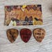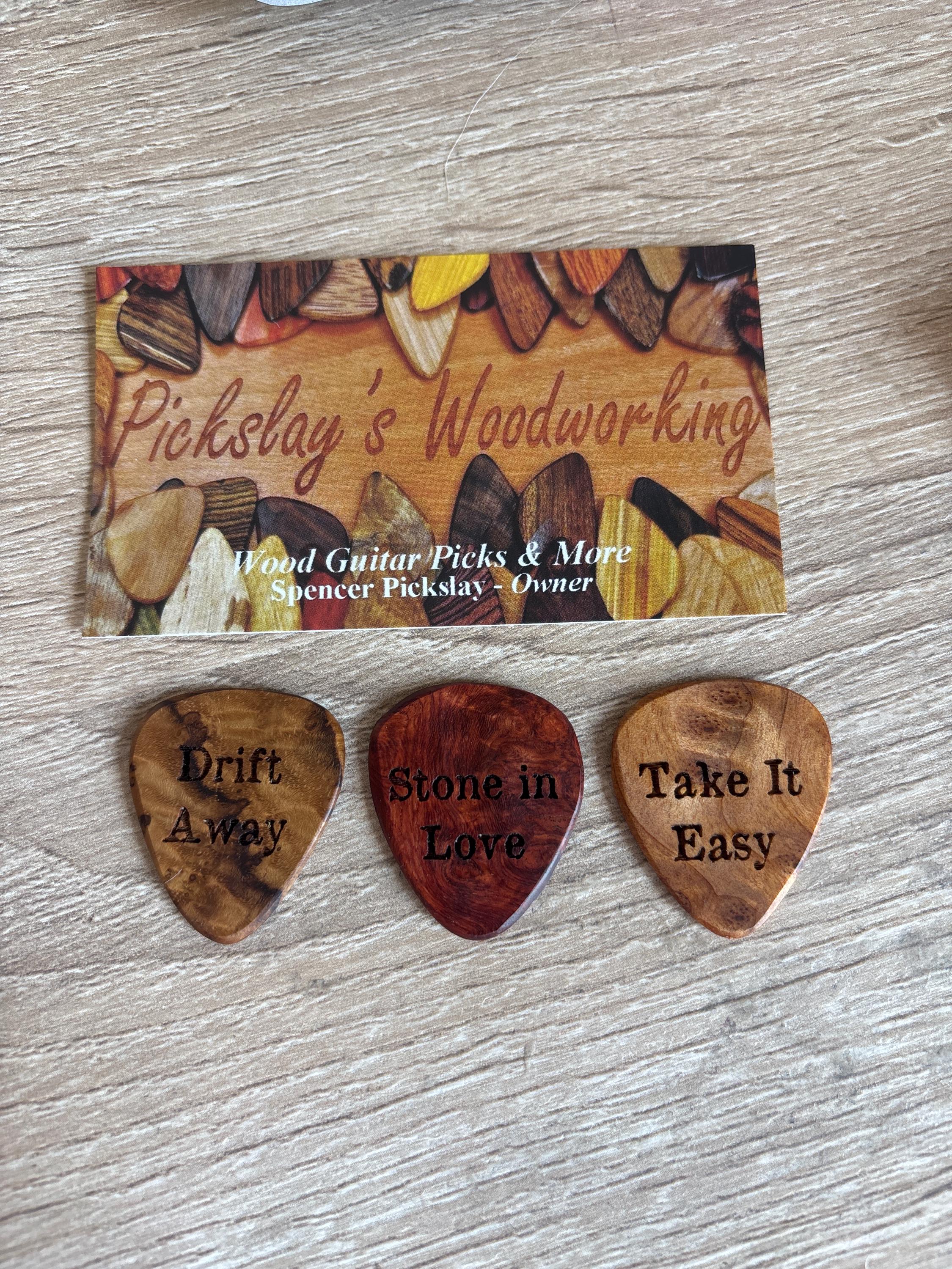 Rare wood guitar picks made of woods from all over the world that I handmade into playable wood guitar picks. The options for engravings are not limited to the pictures above, they are examples to help you come up with your own custom/personalized guitar pick. Contact me for custom images/logos.
